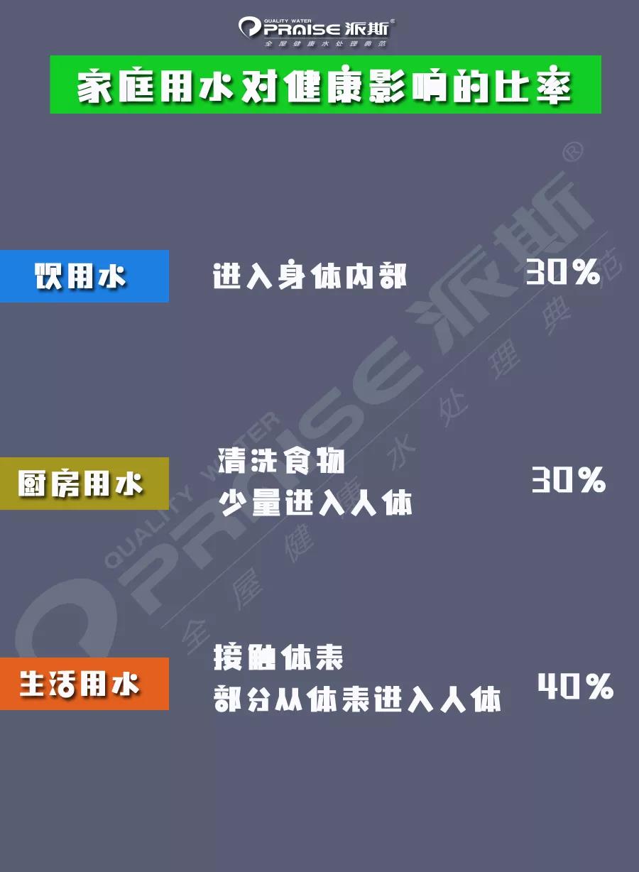 研究證明,生活用水才是家庭用水中對健康威脅最大的存在。每個人對飲水需求有限,以常人論,每人每天的飲水量大致在1.5L左右。廚房用水和做飯的頻次有關,洗菜、淘米、煮飯等都會消耗大量用水,一天三頓的話,三口之家,即使不算上洗水果之類的用水,節省算也可以達到每天15L以上。而生活用水則就更多了,因為你需要洗澡、洗臉、刷牙、沖廁所、澆花、冷氣、供暖等等,起碼是廚房用水的10倍以上。所以,人體每天與生活用水接觸是最多的,僅洗浴一項就超過了飲水和廚房用水的量。而生活用水雖只接觸了人的體表,但是會隨人體皮膚毛孔、粘膜等部位進入人體,水中的一些有害物質還是會進入到人體。一個常見的現象就是,你在洗澡的時候,是在一個密閉的洗浴空間,隨著洗浴時間的增長,你會發現空氣中會有一股“自來水”的味道,這就是自來水中余氯揮發產生的效果,會對人體產生一系列看不到的傷害,時間一長,增加人體很多疾病風險。