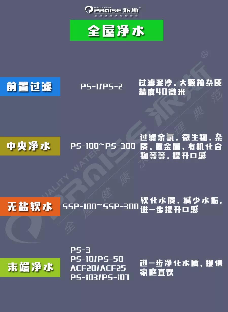 要知道,全屋凈水是一個全新的凈水概念,他涉及的環節包括前置過濾、中央凈水、中央軟水、末端凈水等。以派斯為例,前置過濾裝置的過濾精度為40微米,主要過濾水中的一些大的顆粒狀物質,泥沙等;中央凈水為家庭常用水解決余氯、微生物、雜質、重金屬、有機化合物等問題,還能有效提升水的口感;派斯SSP系列無鹽軟水機,通過物理結晶,有效軟化水質,減少水垢,提升水的口感,同時還能夠為家庭水暖、中央冷氣提供一層有效的保障;派斯末端凈水產品,在全屋凈水中,是一個最后關口,再次過濾水中各種有害物質的同時,有效減少二次污染,提供家庭直飲。